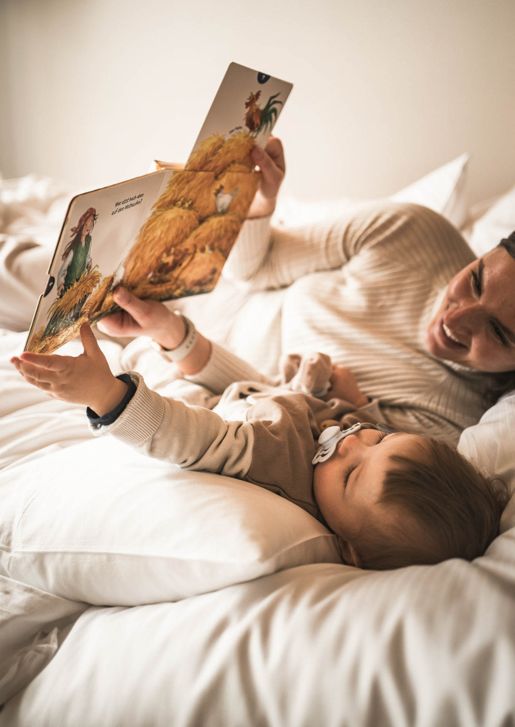 Ein zartes Fingerchen, das vom Arm der Mutter in Richtung Unbekanntes zeigt, zwei vorsichtige Füßchen, die von der Hand des Vaters geführt ins Abenteuer tapsen. Bei uns gibt es so viel zu bestaunen und begreifen.